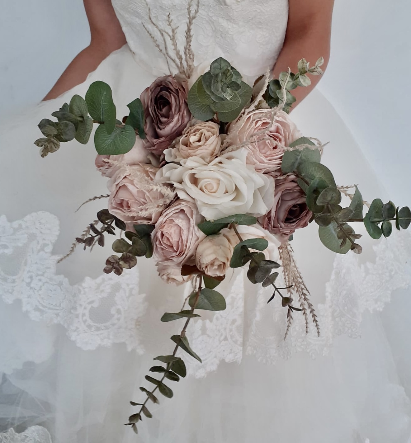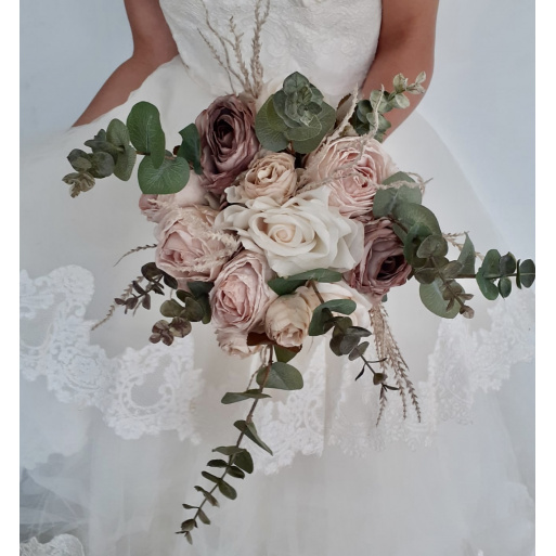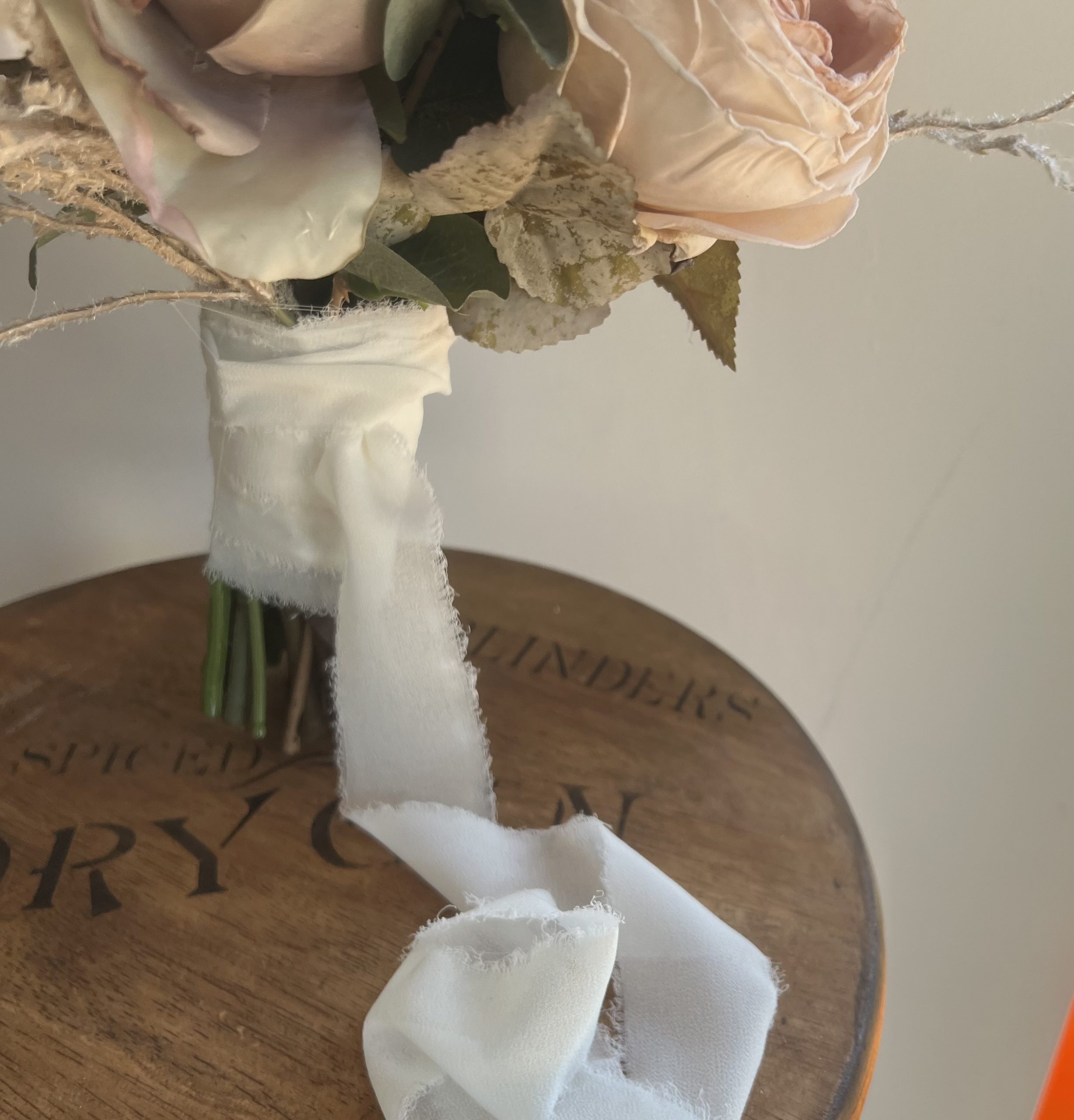 Get the Modern Bohemian look with this stunning wild posy bouquet. The highest quality faux stems have been combined and arranged to create a classic style bouquet that looks just like a fresh bunch. Stunning colour combinations with Ivory and mauve tones. Handle stems are bound with raw chiffon ribbon.