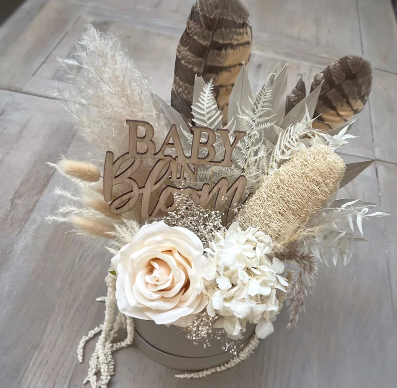 This stunning hatbox arrangement contains an eclectic mix of luxury faux, dried and preserved stems along with sun palms and sustainably sourced feathers to create a unique gift or centrepiece. With just a little bit of care this arrangement will last longer than any fresh alternative as stems have been put through a preserving process to keep them looking beautiful.