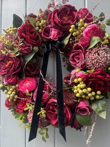 Our design ‘Burgundy opulence’ combines beautiful colours of rich burgundies, mauve pinks, blues and greens embellished with seasonal berries and a beautiful navy velour bow. These beautiful colours will take this wreath right through autumn into winter for that cosy home entrance.