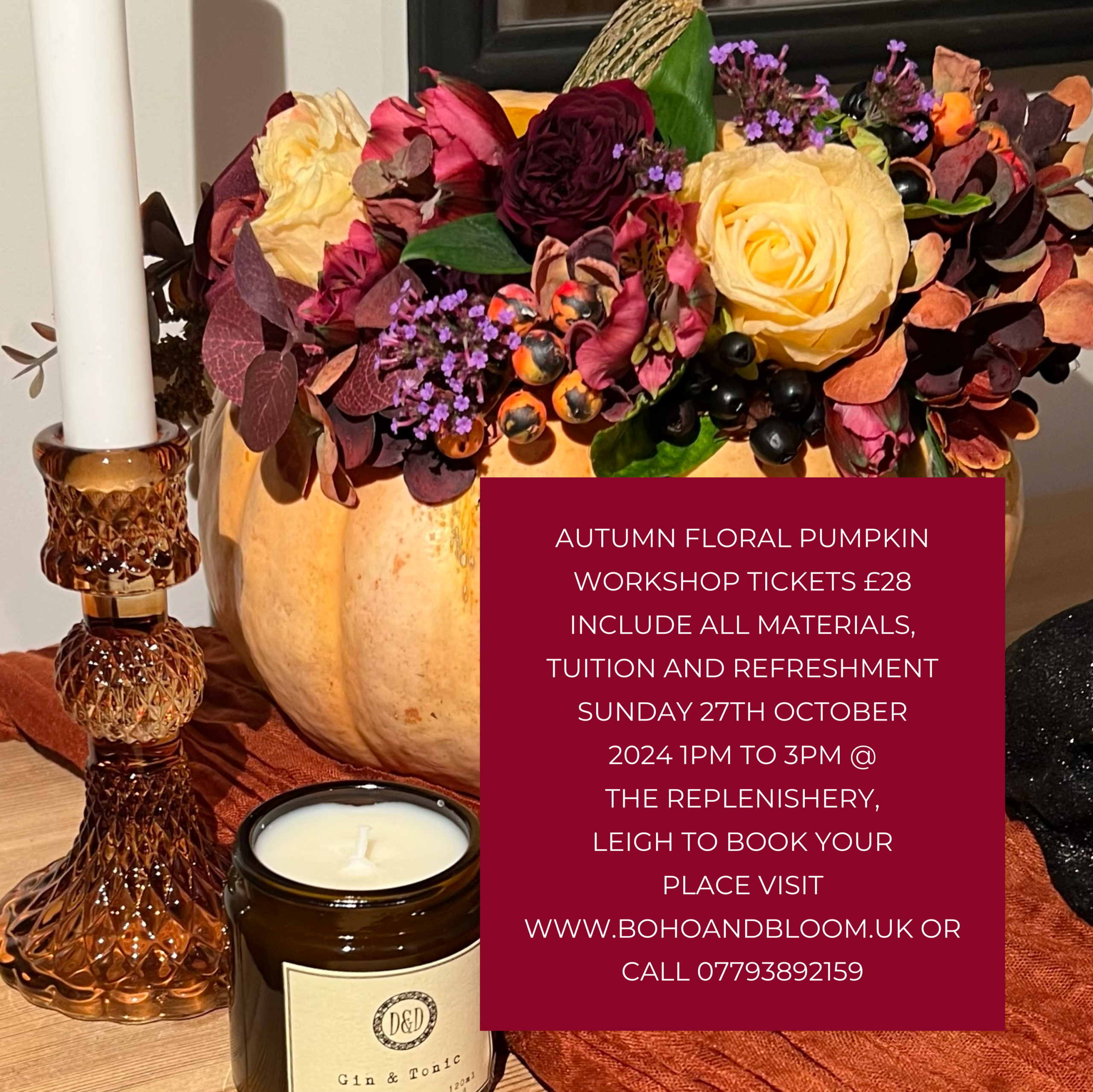 Spend an afternoon of crafting with Boho&Bloom! We will show you how to create your own pumpkin floral display to display in your home this Halloween. Everything you need will be supplied by us. Join us at the Replenishery refill shop in Leigh for this autumnal afternoon.