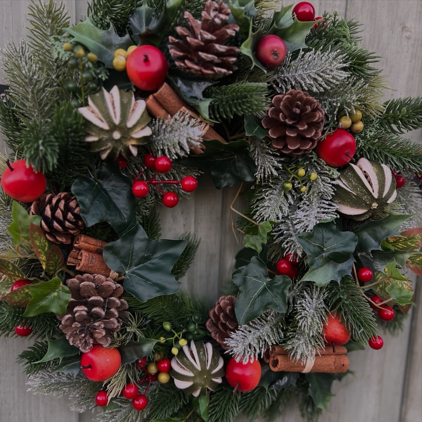 Bring timeless festive charm to your home with this beautifully handcrafted Christmas wreath. Lush evergreen foliage forms a full, natural base, accented with frosted fir tips for a subtle winter sparkle. Traditional elements like pinecones, cinnamon sticks, glossy red apples, and clusters of vibrant berries are thoughtfully arranged to create depth, texture, and warmth.