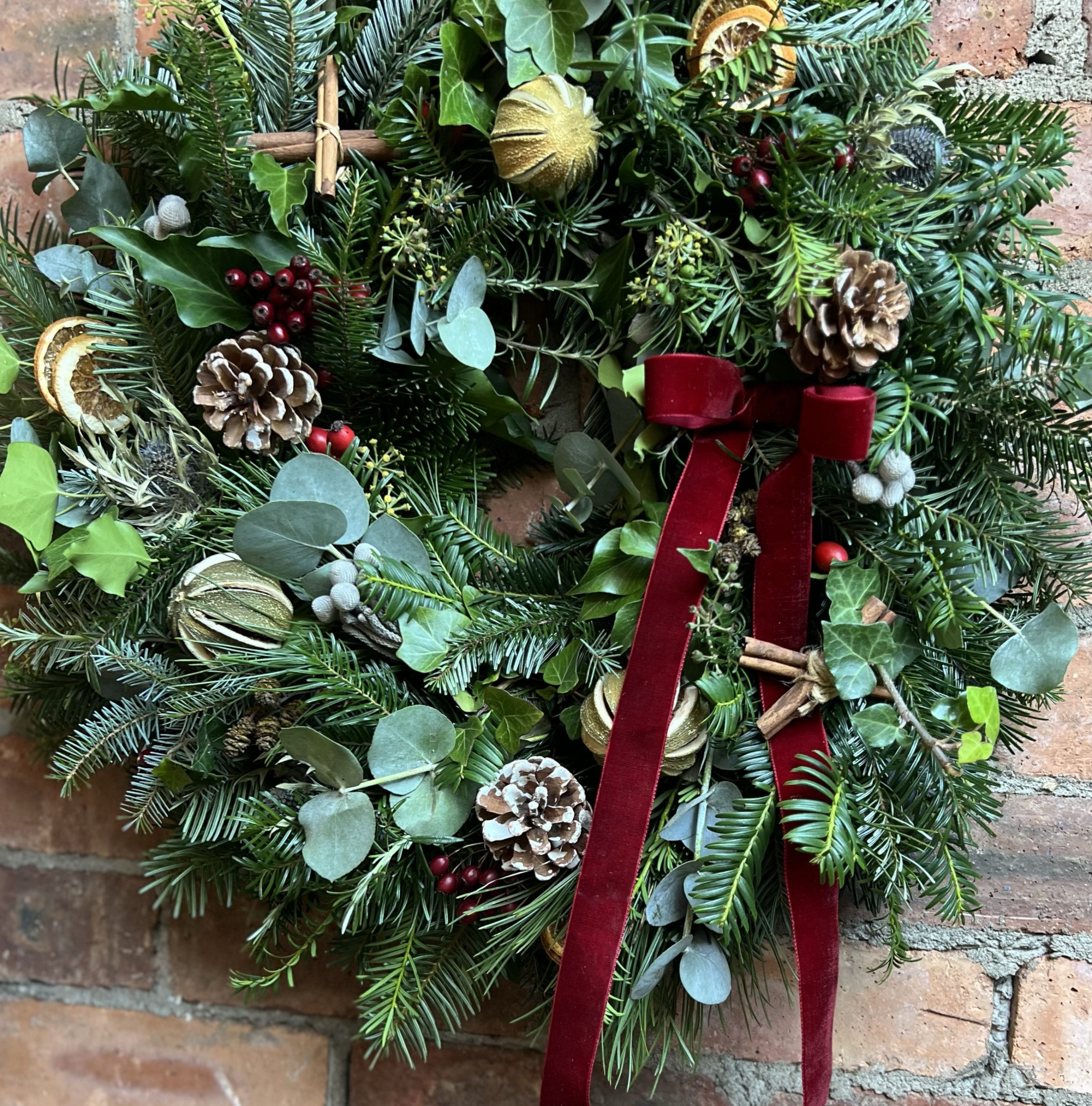 Stunning Fresh Foliage wild door wreath adorned with seed heads, limes, cinnamon sticks, cones and more to create a beautifully wild fragrant addition to your home and bring in the festive season.
