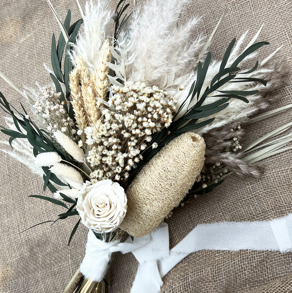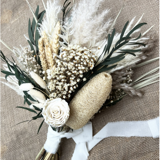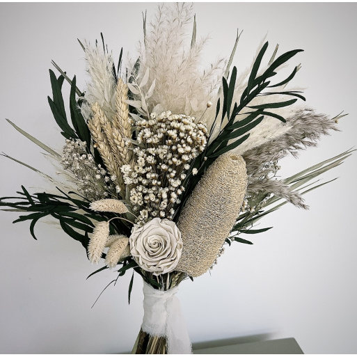 Stunning Dried and preserved lasting bouquet. Created with a beautiful mix of luxury dried & preserved flower stems in green and neautral hues to create a floral statement piece perfect for making a entrance. This bouquet is perfect for a Festival, Event Styling or bohemian wedding.