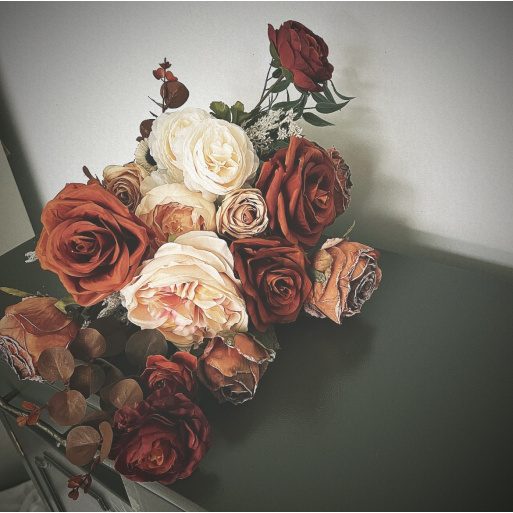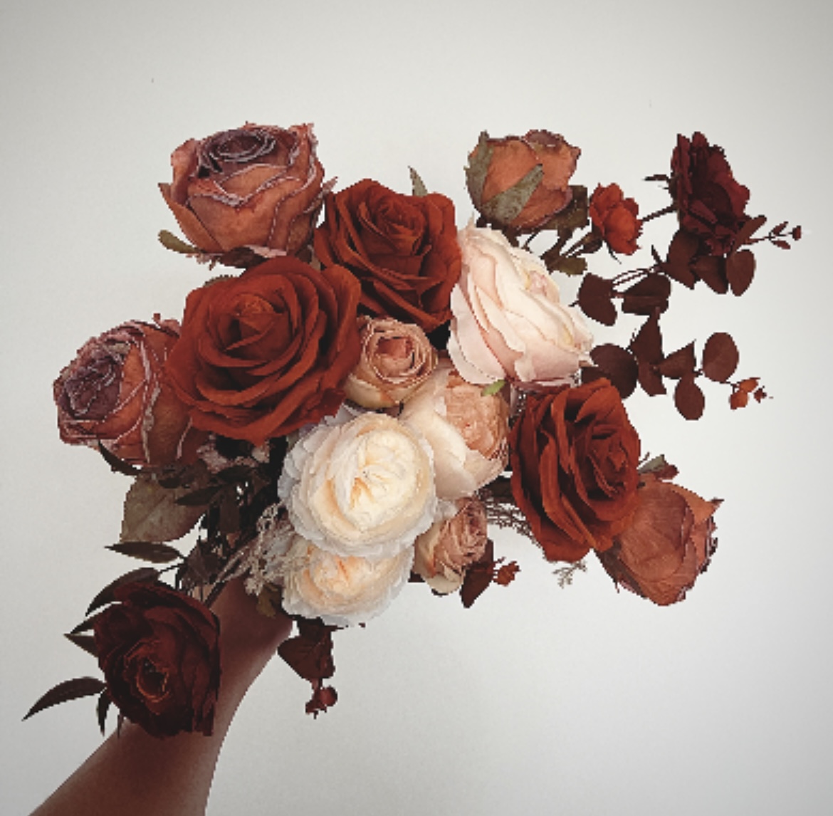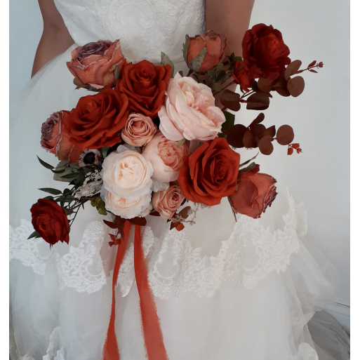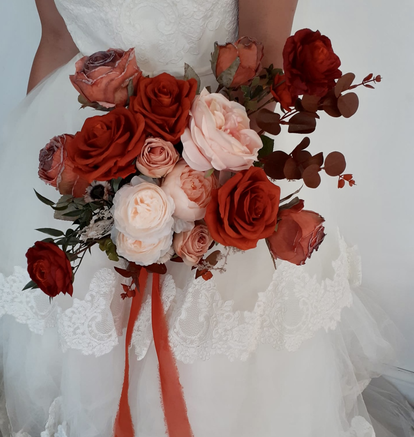 Get the Modern Bohemian look with this stunning wild bouquet. The highest quality faux stems have been combined and arranged to create a loose Boho style that looks just like a fresh bouquet. Stunning colour combinations with rust and peach tones. Handle stems are bound with raw rust chiffon ribbon.