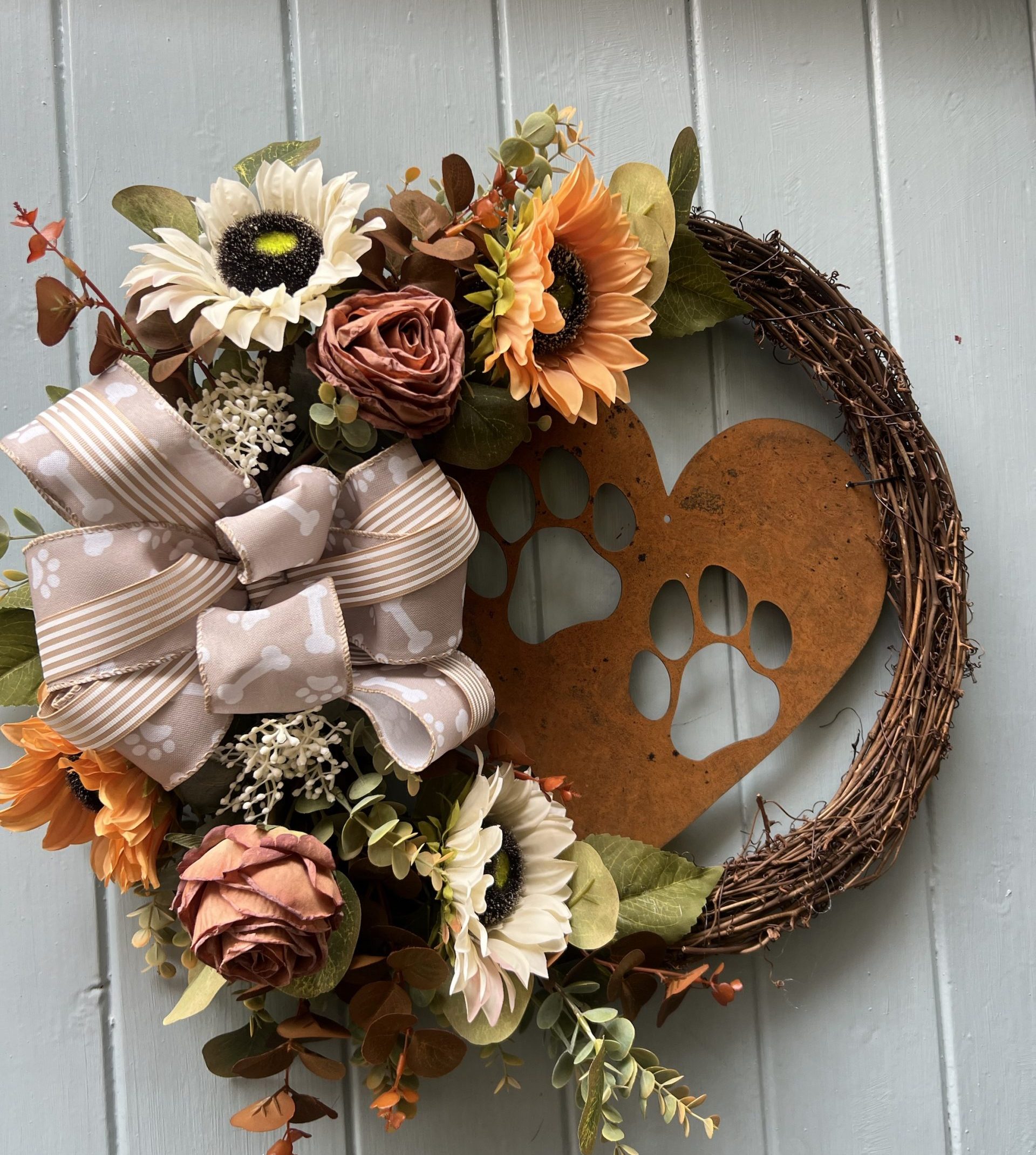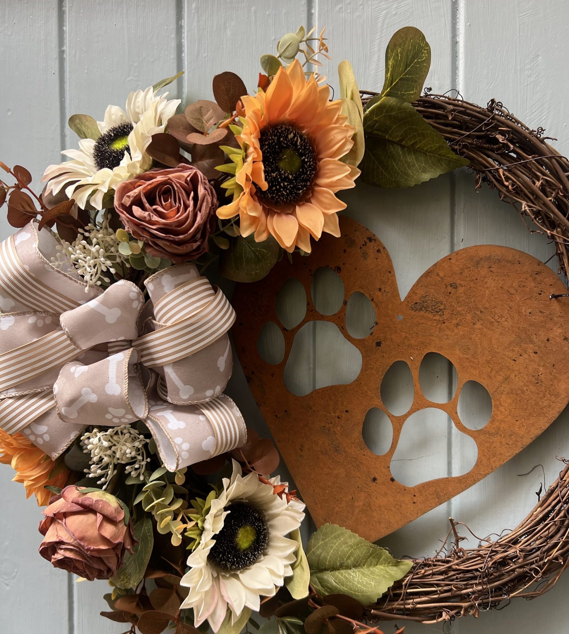 Our ‘Paws’ door wreath has been Handmade and packed with beautiful branches and autumnal florals to create a wreath perfect for the season and will last on your door for years to come nestled on a natural twisted willow ring.