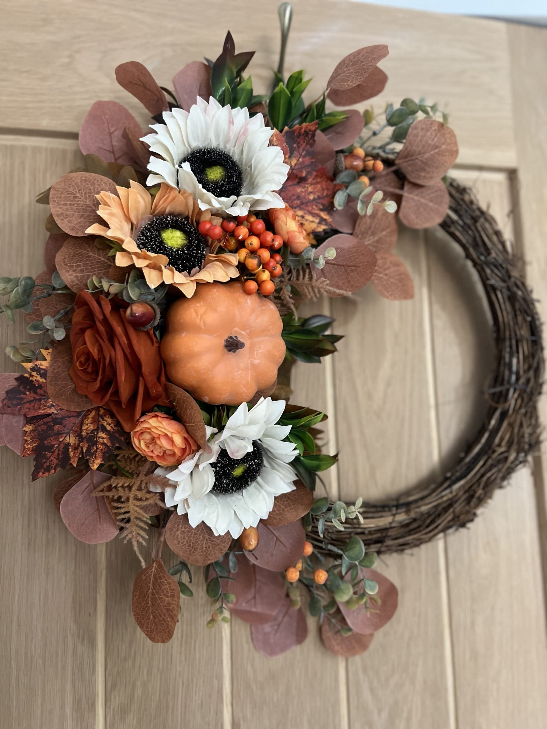 Our Rustic autumn door wreath has been Handmade and packed with beautiful branches and autumnal florals to create a wreath perfect for the season and will last on your door for years to come nestled on a natural twisted willow ring.