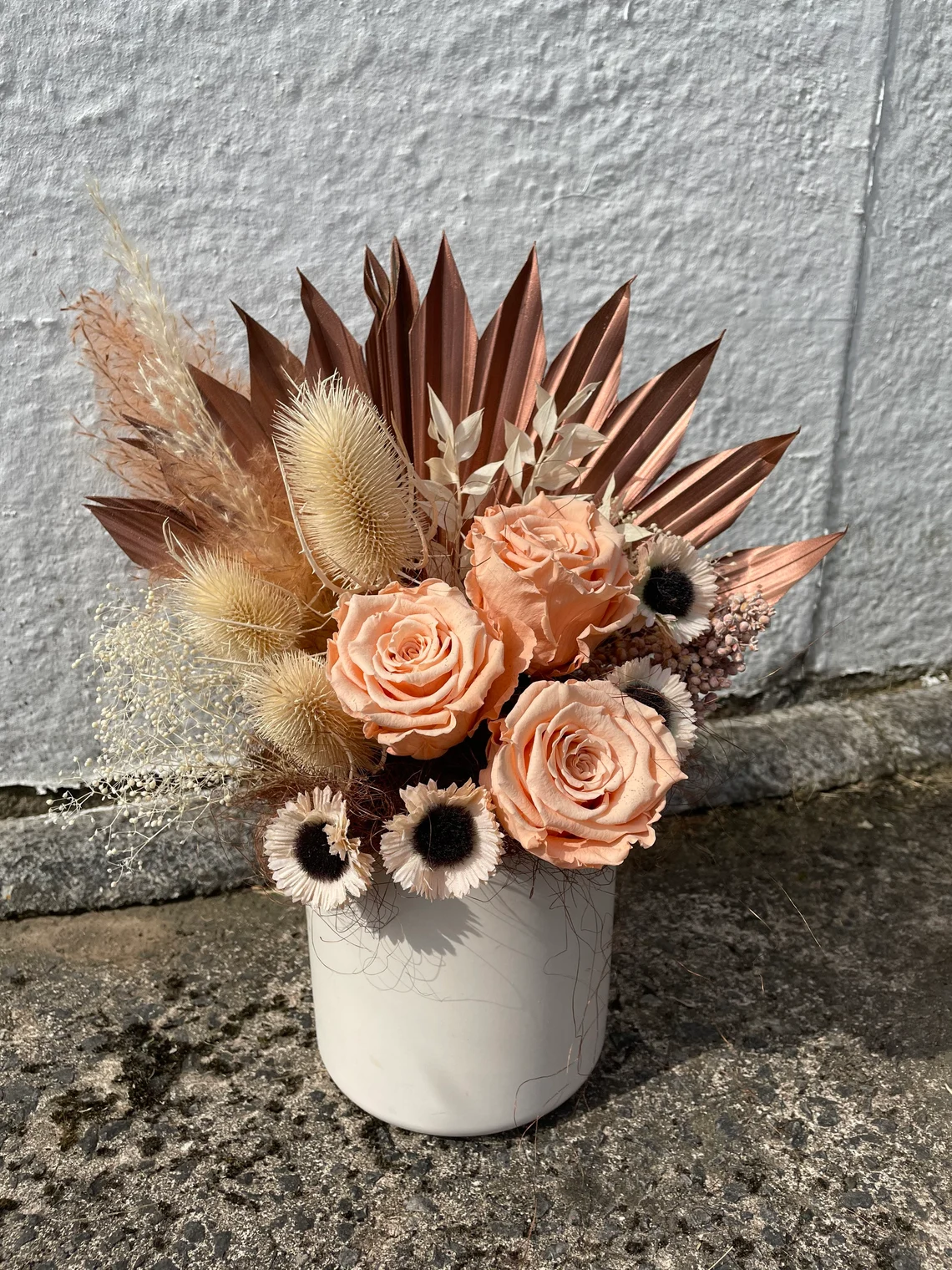 This stunning dried flower arrangement contains real roses, foliage’s and palms that have been put through a preserving process to keep them looking beautiful. Get Instagram worthy flowers for your home or as a special gift.