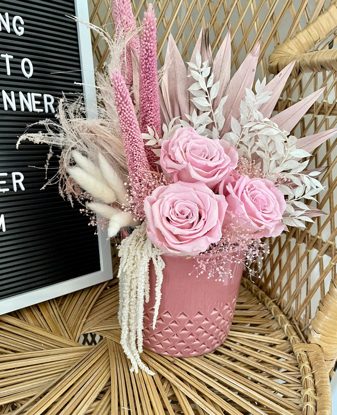 Pretty in Pink Preserved Roses and foliage dried flower arrangement hostess gift pot