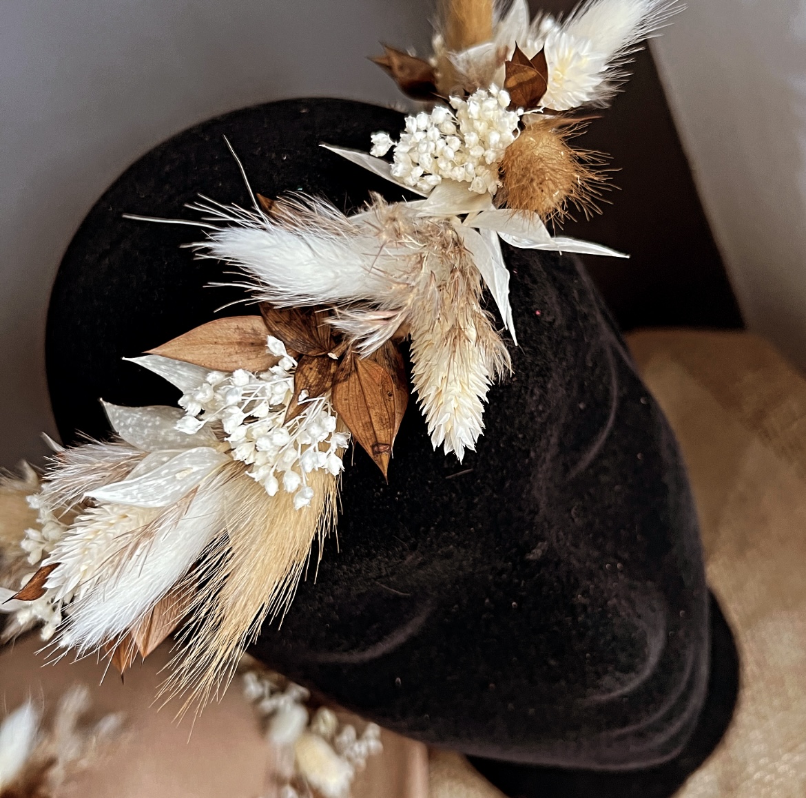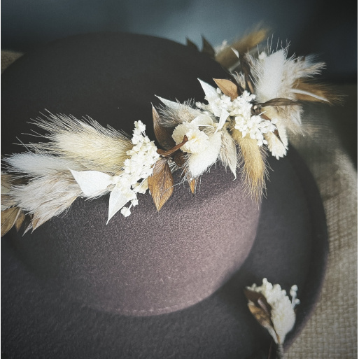 Stunning Dried and preserved lasting crown from our ‘Earth’ range shop for matching accessories including buttonholes, hair pins and Fedora statement Hat.