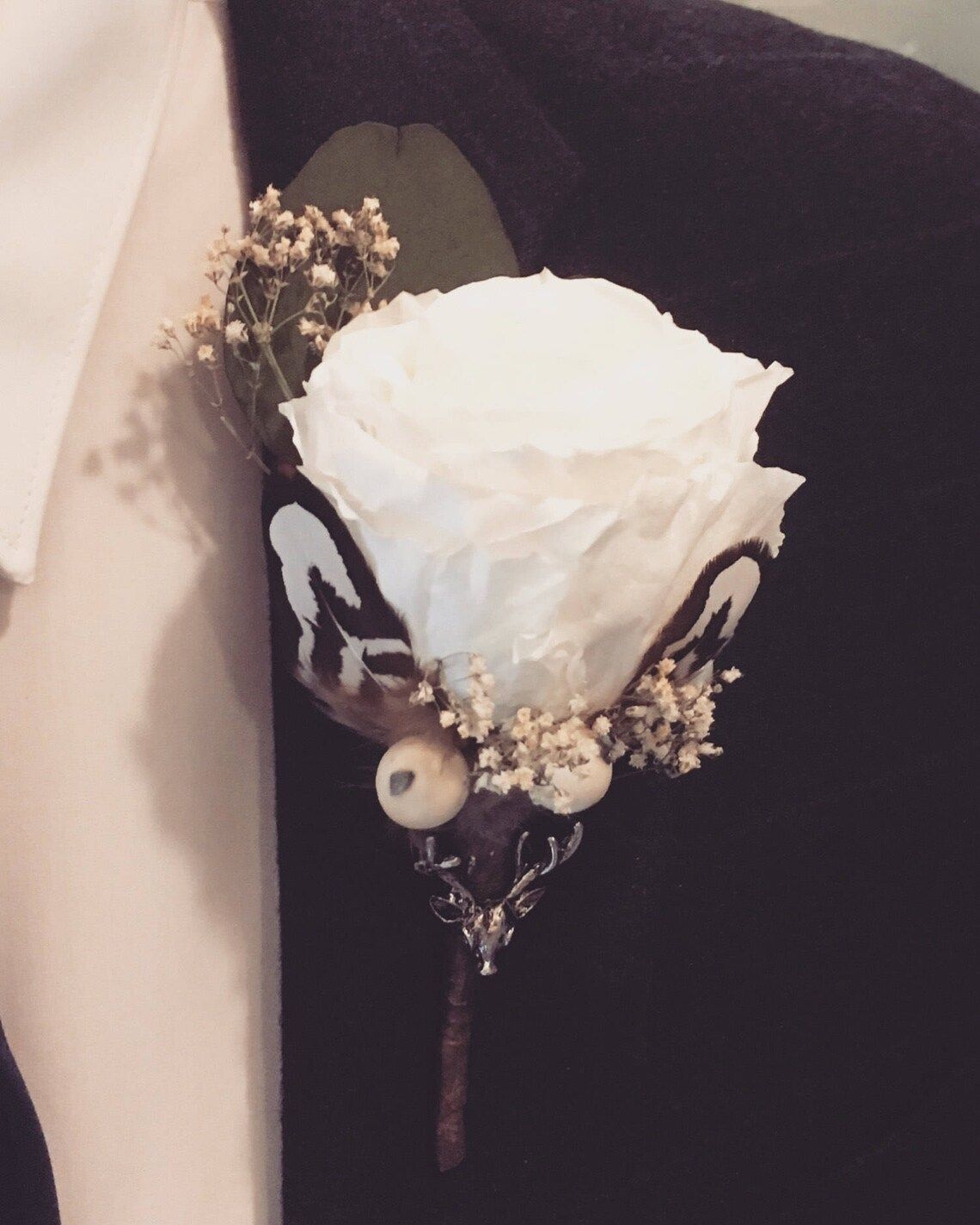 This stunning buttonhole is made using a preserved rose and foliage that have been put through a preservation process to keep them looking like they’ve just been picked.