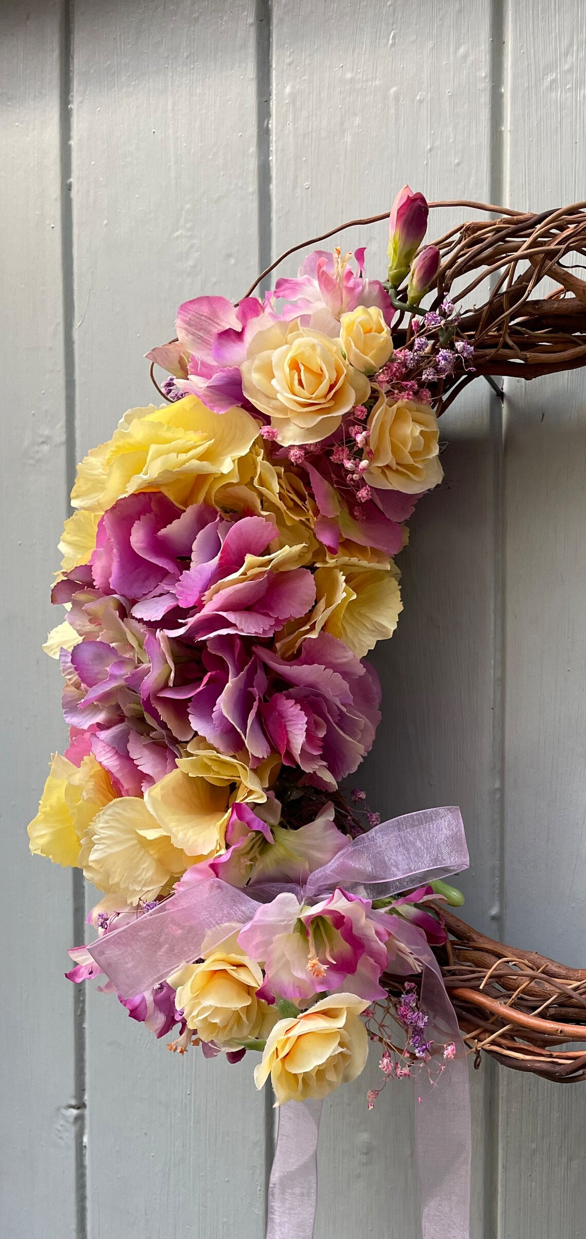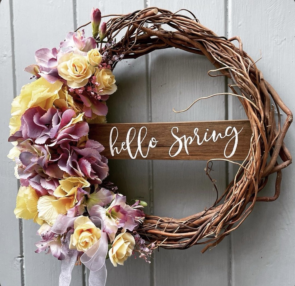 Handmade floral twisted willow Hello Spring wreath in spring colours high quality flowers nestled on a natural twisted willow ring.