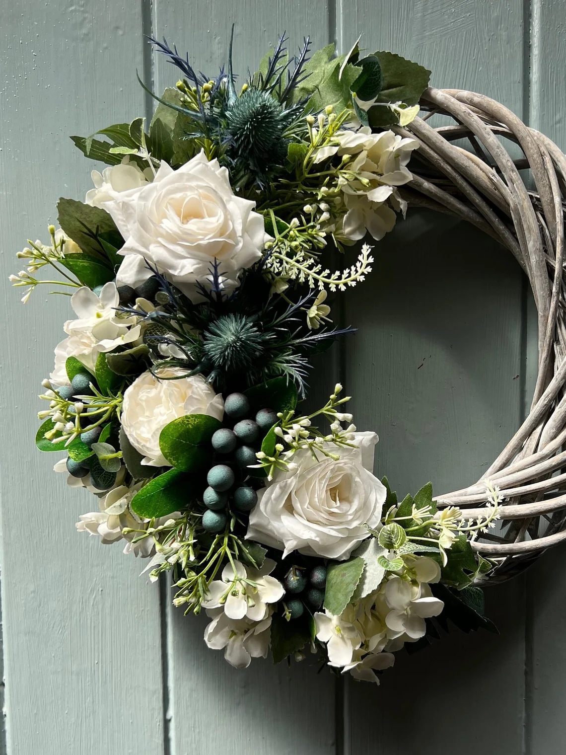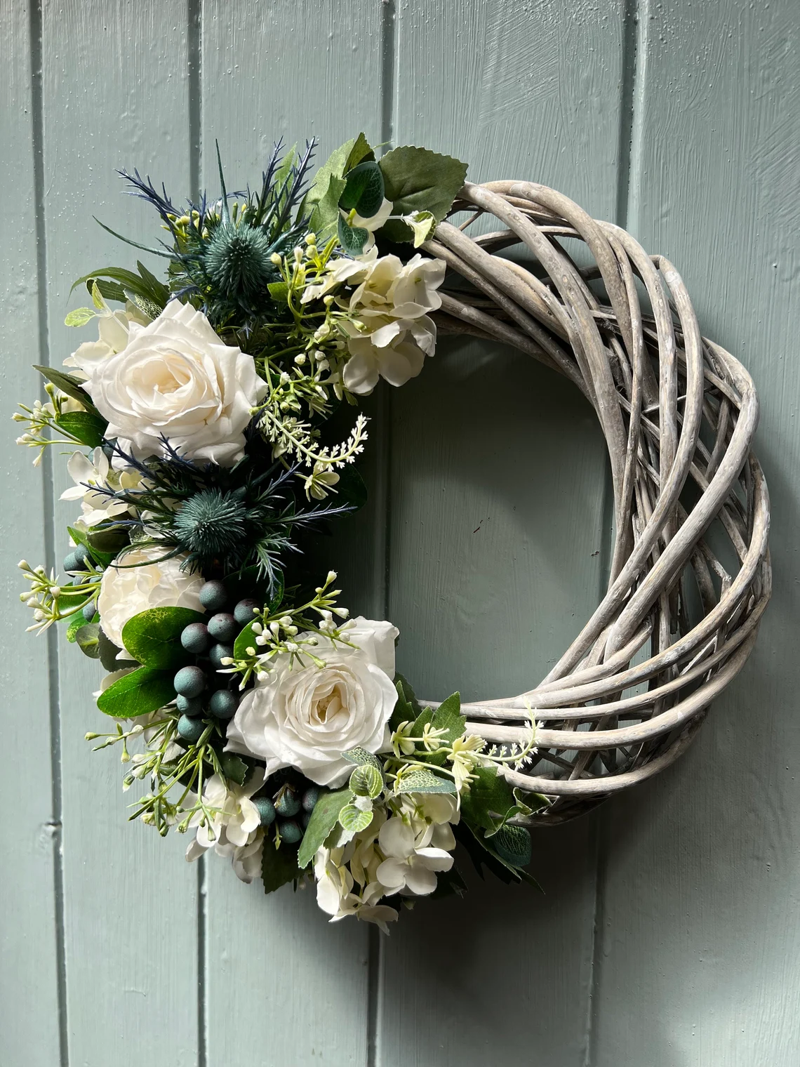 Our ‘Moody Blue’ door wreath has been Handmade using high quality artificial foliage and flowers to give the illusion of a fresh wreath which will last on your door for years to come in beautiful hues of blue, turquoise and white nestled on a natural washed grey twisted willow ring.